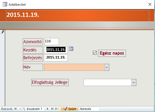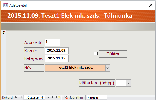 Az "Adatbeviteli" űrlap "Kezdés", illetve "Befejezés" dátuma azt a napot