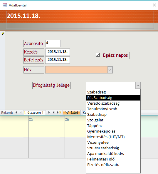 Ez esetben a lenyíló ablakokban a nevet, valamint az adott "Elfoglaltság jellegét", azaz a távollét okát kell megadni.