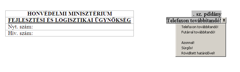 2. MS Word Office 2007-ben: kattintson a 3 űrlap valamelyikére ("...sz. példány", vagy a "Telefaxon továbbítandó!", vagy az alatta lévő "üres" adatmezőre). A lenyíló ablakban válassza ki a kívánt kezelési bejegyzést.