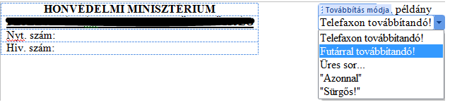 2. MS Word Office 2007-ben: kattintson a 3 űrlap valamelyikére ("...sz. példány", vagy a "Telefaxon továbbítandó!", vagy az alatta lévő "üres" adatmezőre). A lenyíló ablakban válassza ki a kívánt kezelési bejegyzést.
