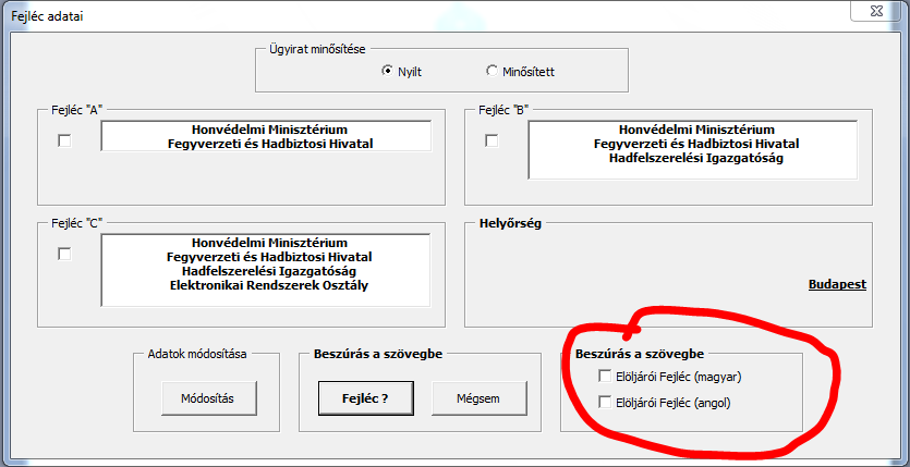 Válassza ki a kívánt nyelvű (magyar vagy angol) fejléccel készítendő irat fajtáját (pl. Elöljárói Fejléc (angol).
