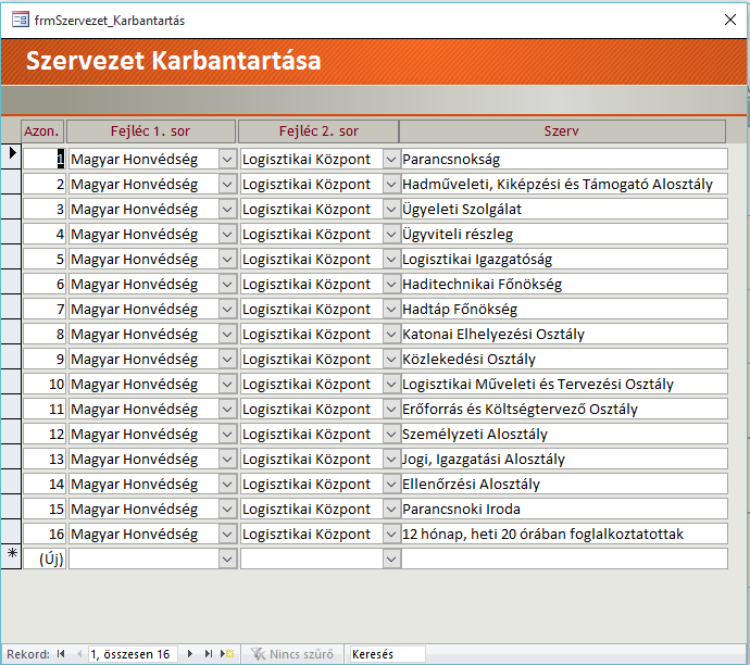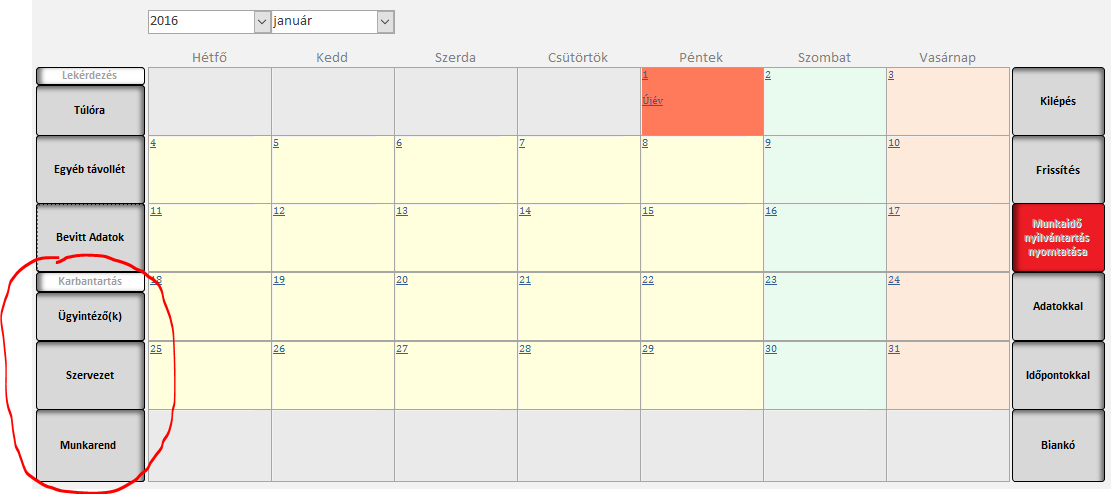 Az Ügyintéző(k)-re, Szervezetre, valamint a Munkarendre vonatkozó karbantartást 3 nyomógomb teszi lehetővé.